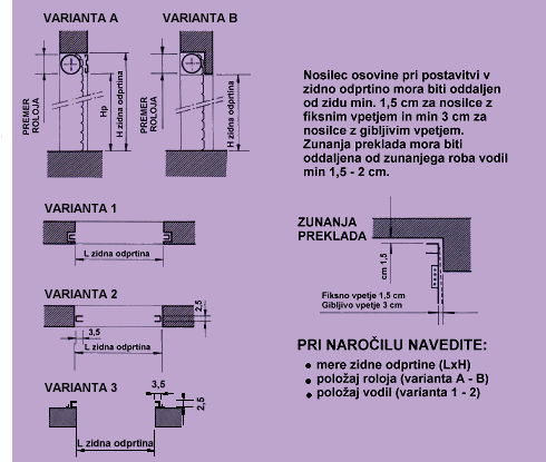 PRI NAROČILU NAVEDITE: mere zidne odprtine (LxH), položaj vodil (varianta 1 ali 2), položaj rolete (varianta A in B).